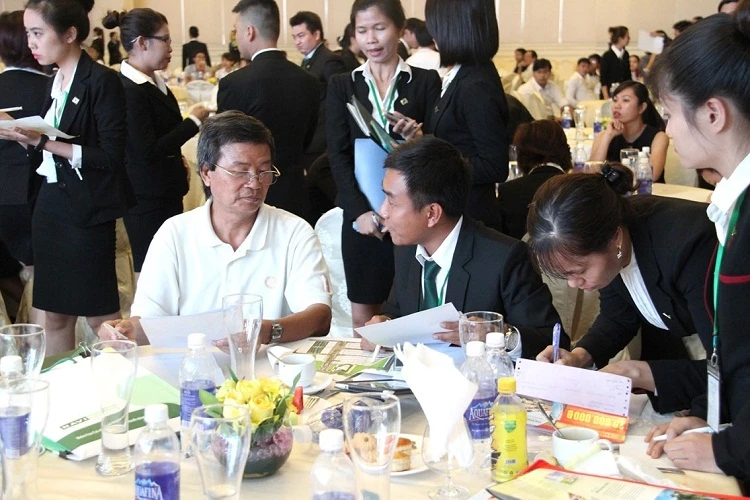 Nhân viên kinh doanh đang tư vấn khách hàng tại sự kiện.