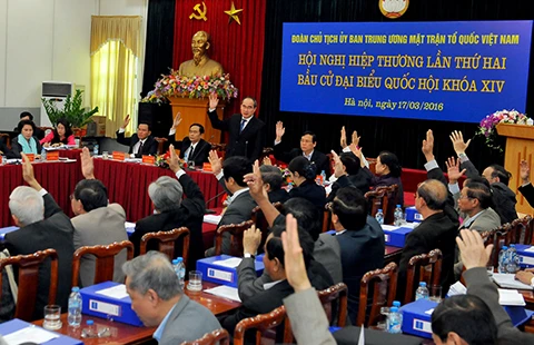 Hội nghị hiệp thương lần thứ hai bầu cử QH khóa XIV biểu quyết thông qua danh sách sơ bộ những người ứng cử thuộc khối trung ương. Ảnh: HOÀNG LONG
