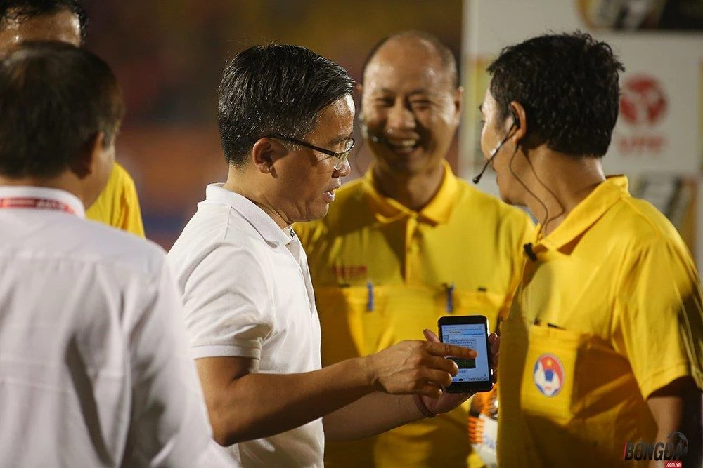 Trưởng đoàn HA Gia Lai than phiền về sai sót của trọng tài Nguyễn Nam Trung (phải). Ảnh: BÓNG ĐÁ