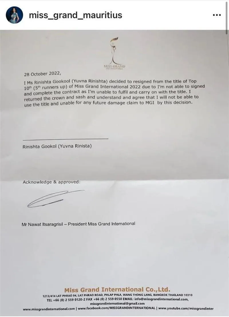 Đây là hình ảnh đầy đủ hợp đồng không có chữ ký của Yuvna Rinishta - người đẹp của chúng tôi" - phía Miss Grand Mauritius cho biết.