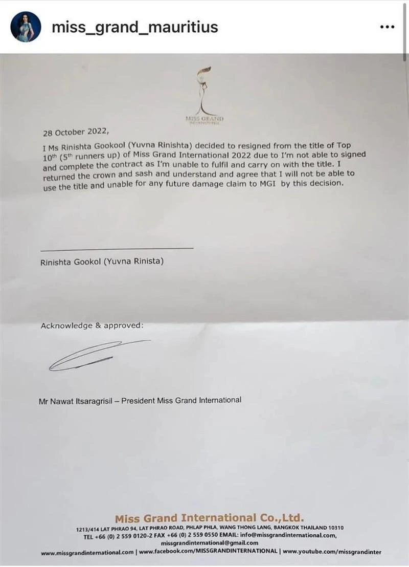 Theo BTC Miss Grand Mauritius và Yuvna Rinishta, người đẹp đã bị BTC Miss Grand International ép ký vào tờ đơn từ bỏ danh hiệu với nội dung không thể hoàn thành nhiệm vụ.
