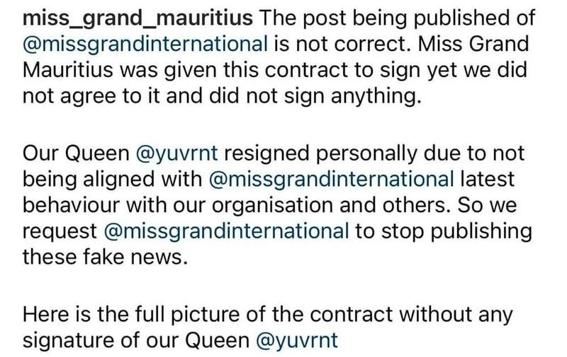 "Bài viết được Miss Grand International đăng là không đúng sự thật. Miss Grand Mauritius đã được giao hợp đồng này để ký, nhưng chúng tôi không đồng ý và không ký bất cứ điều gì.