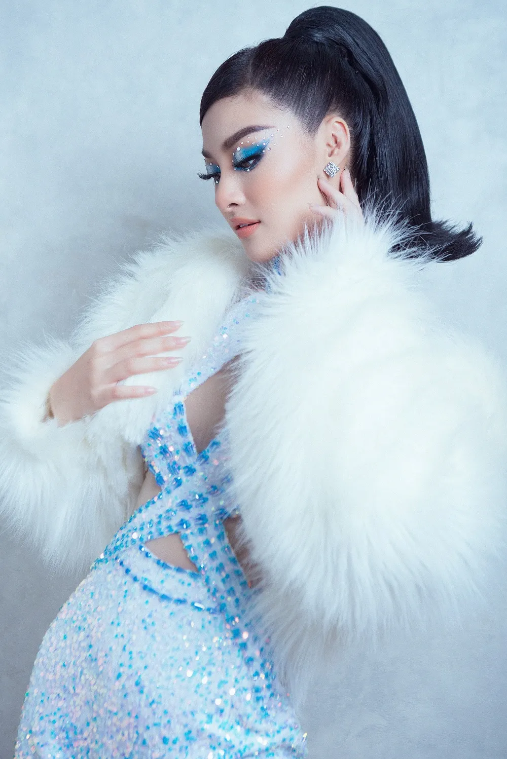 Lona hóa thành quý cô sang chảnh bởi lối trang điểm với phần mắt đính hạt lấp lánh.