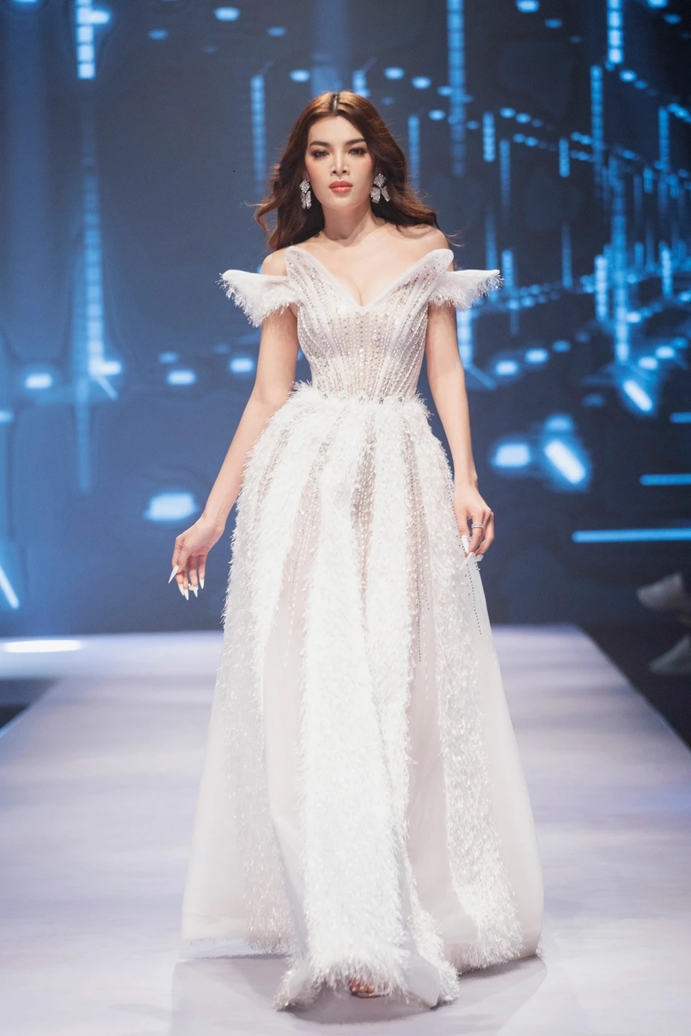 Phùng Trương Trân Đài thì xuất hiện với thiết kế có phần chân váy dài lộng lẫy. Cùng với thần thái rạng ngời, nét đẹp của sự tự tin, thông minh và thời thượng, Hoa hậu Trân Đài đã thể hiện được tinh thần lấp lánh và tỏa sáng của chiếc váy lần này.