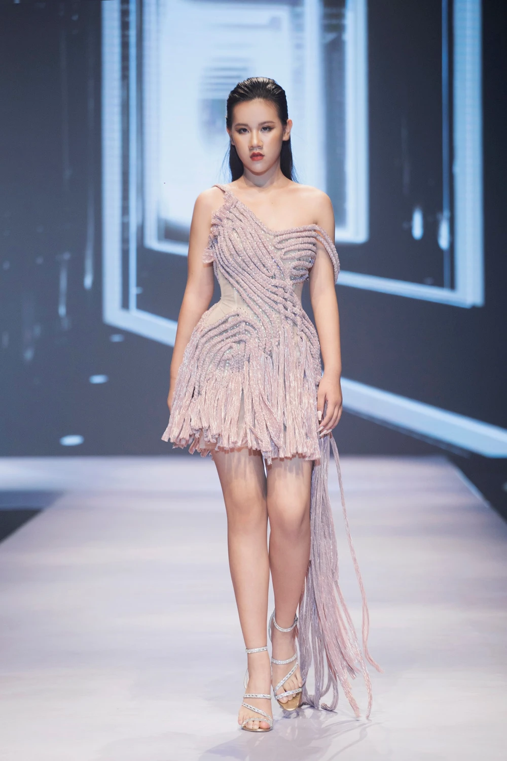 Sánh bước cùng Ngọc Thảo là model kid Victoria Phương Trang. Xuất hiện với bộ cánh màu hồng ngọt ngào và điểm nhấn là các tua rua bản lớn, Victoria Phương Trang như một nữ chiến binh mạnh mẽ và phóng khoáng.