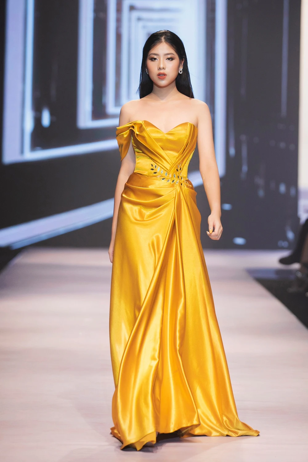 Điểm khác biệt là ở bộ váy của Bella Vũ được thiết kế xòe rộng, toát lên được sự trẻ trung nhưng cũng không kém phần quý phái của một nàng công chúa kiêu sa.