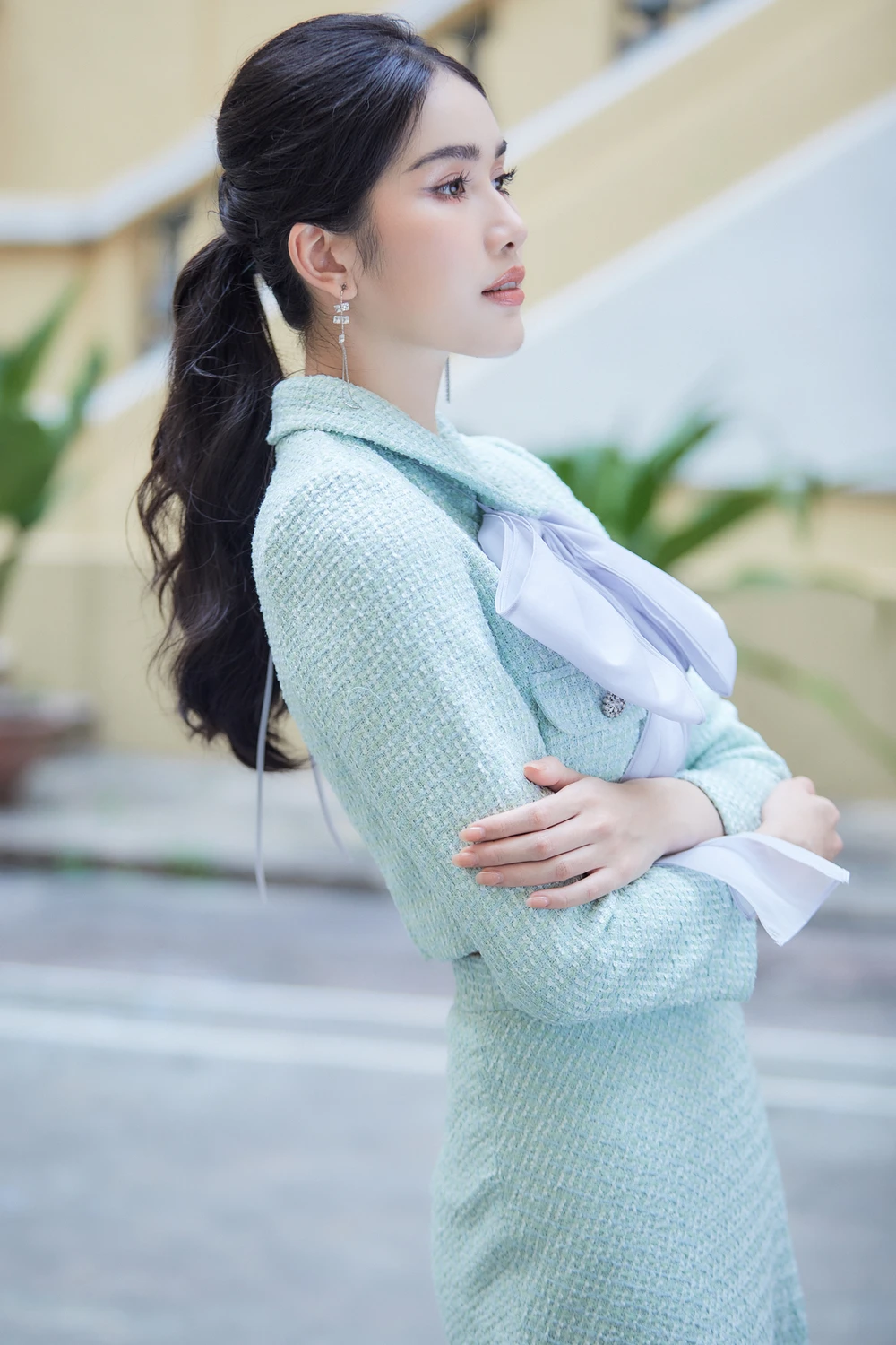 Vẫn với lối trang điểm nhẹ nhàng, nàng hậu lần này khéo léo lựa chọn những trang phục tôn lên thần thái nhã nhặn, sang trọng của mình trong từng khung hình.