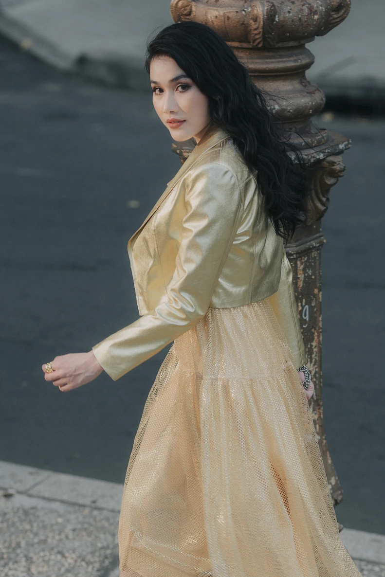 Xuyên suốt các mẫu thiết kế là những gam màu cực kỳ bắt mắt với ánh đồng, gold, silver, một số hoạ tiết vô cùng cá tính như da rắn, kẻ sọc, ca rô trên nền ánh nhũ kim tuyến cực kì cao cấp.