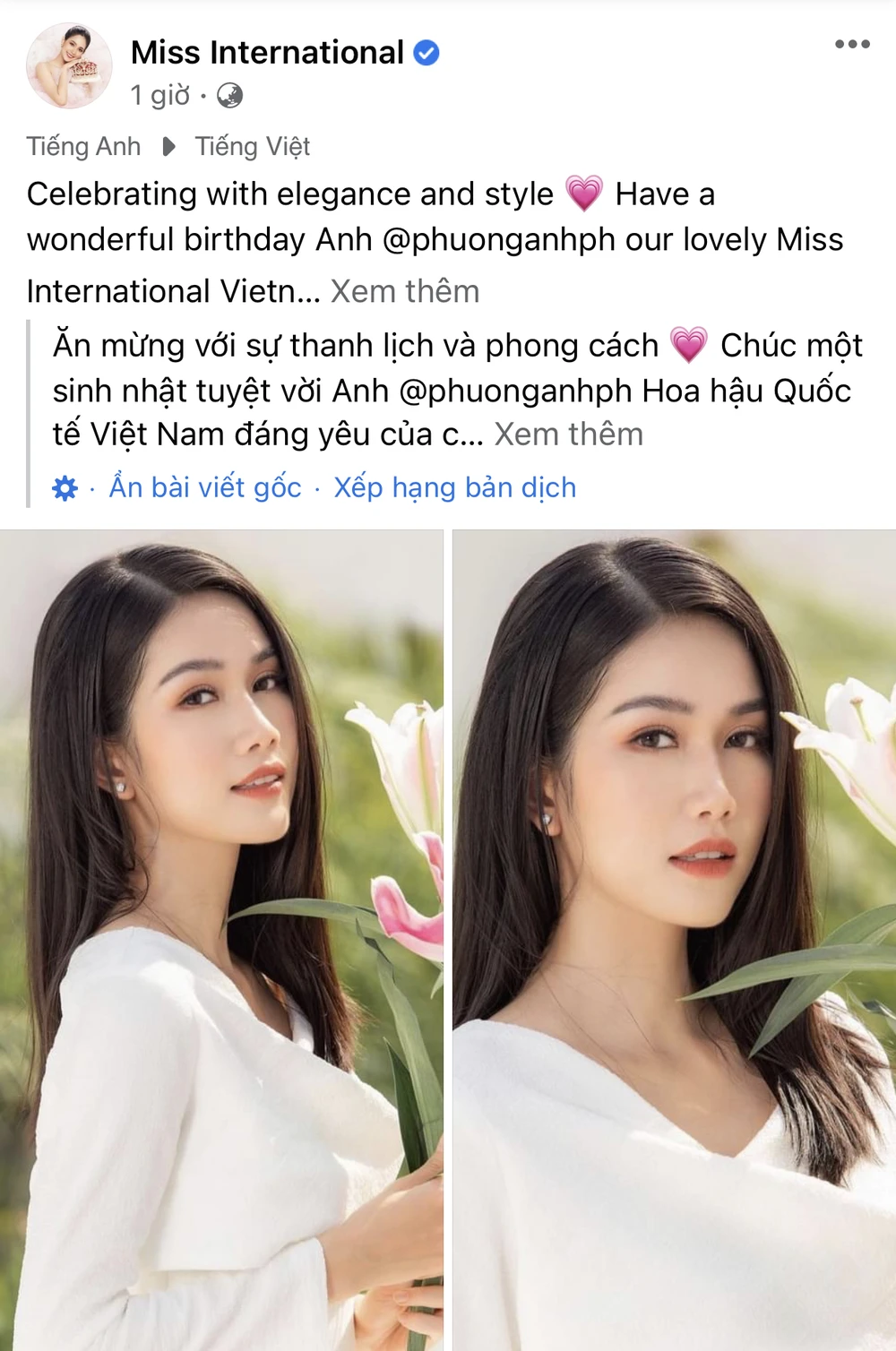 Mới đây nhất, nàng hậu tiếp tục gây sốt với bộ ảnh mới toanh, đánh dấu cột mốc khi bước sang tuổi 23. Không những thế, fanpage chính thức của cuộc thi Miss International cũng đăng tải hình ảnh chúc mừng cho đại diện đến từ Việt Nam.