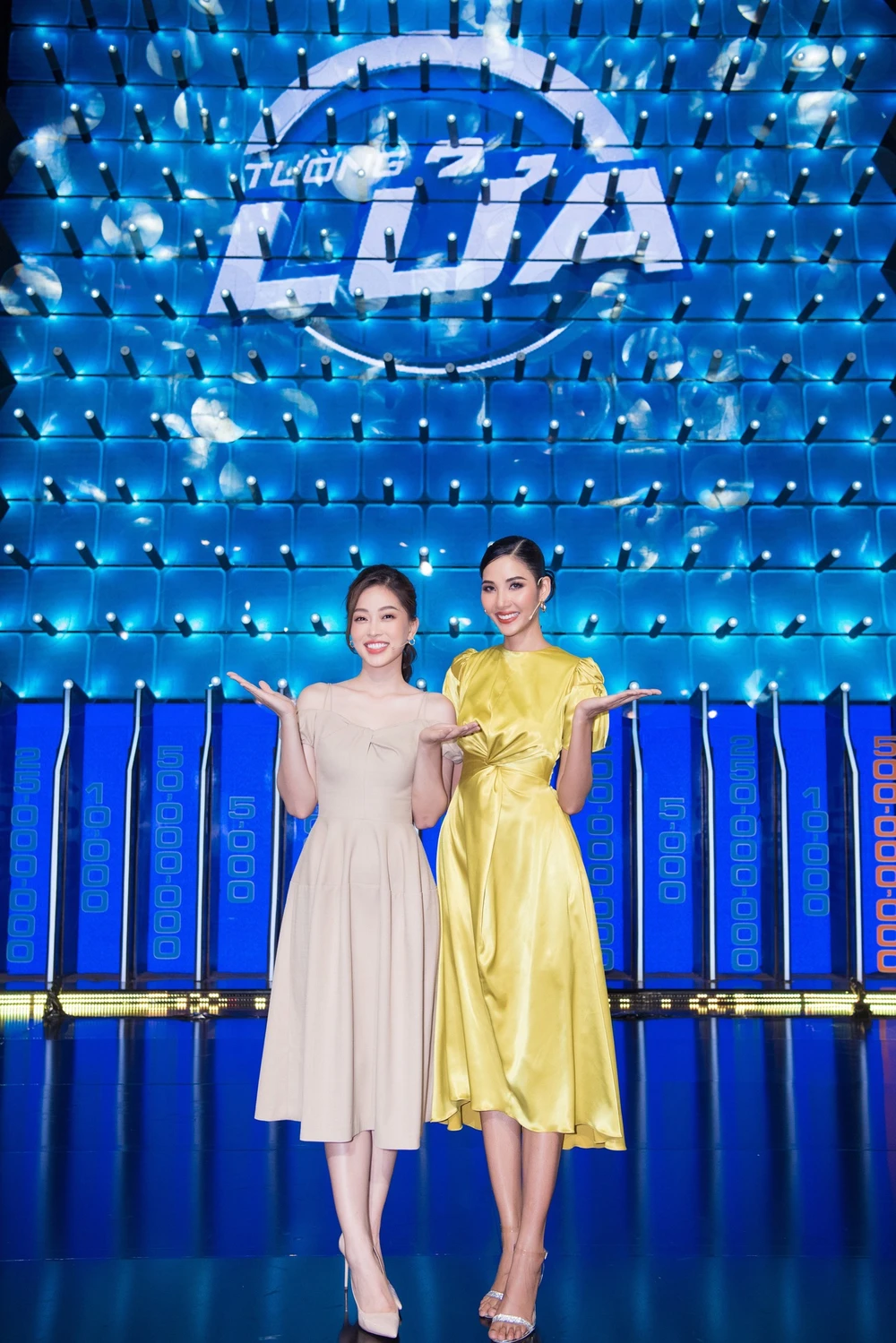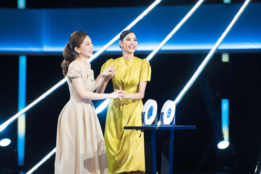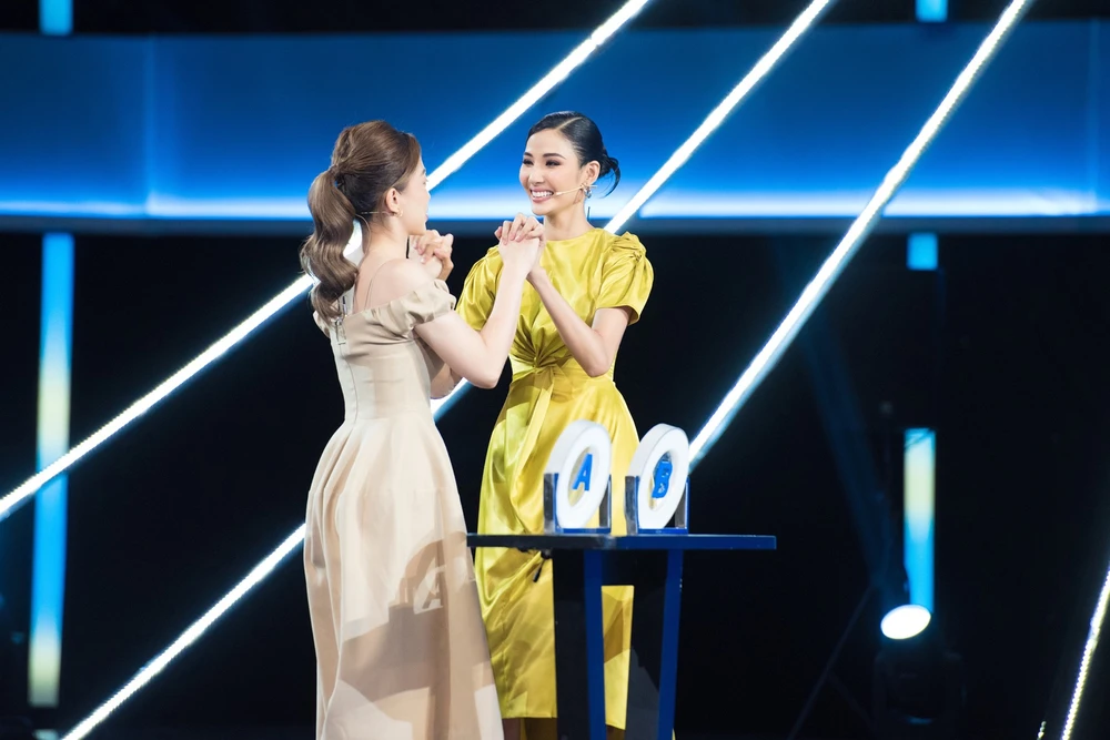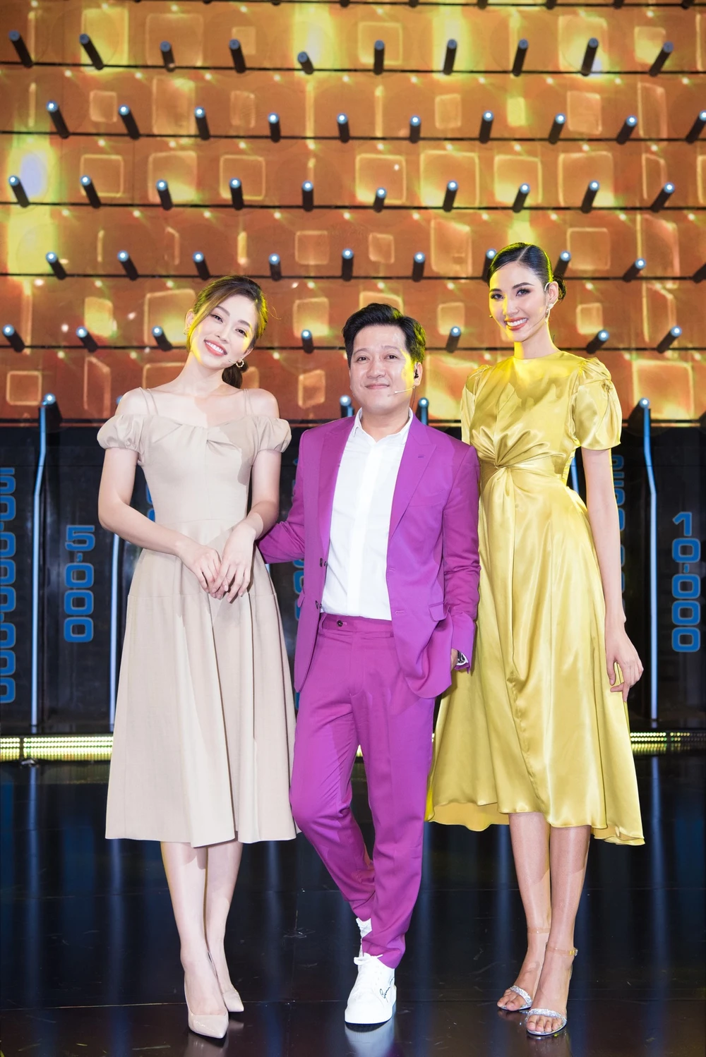 Đồng hành cùng cô lần này chính là Á hậu Hoàng Thùy, cả hai có chiều cao khủng đã dìm hàng MC Trường Giang hoàn toàn.
