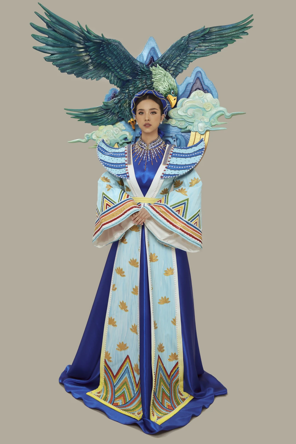 Á hậu Thúy An vừa chính thức công bố bộ quốc phục sẽ cùng nàng hậu sải bước trên sân khấu Miss Intercontinental là Phi thúy sơn - Điểu tinh đoạt công chúa của nhà thiết kế Nguyễn Minh Tuấn.
