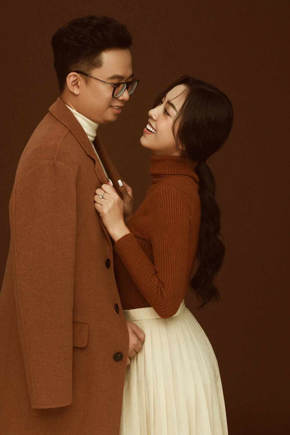 Kiểu dáng cúp ngực cùng thân váy xòe, kết hợp layout tóc nhẹ nhàng giúp tôn lên nét dịu dàng, nữ tính của nàng hậu. Cũng theo phong cách ảnh cưới Hàn Quốc, cặp đôi chọn trang phục tối giản màu gỗ mang lại cảm giác ấm áp cũng nhưng không kém phần tinh tế, thanh lịch.