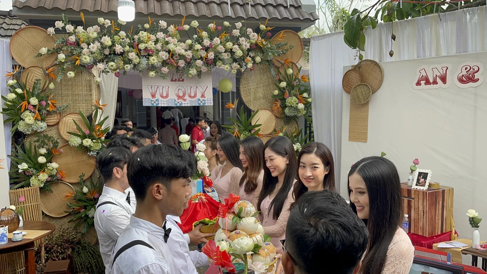 Lễ vu quy được diễn ra tại Kiên Giang cũng là quê hương của nàng Á hậu. Sự kiện trọng đại của người đẹp cũng không thể vắng bóng hội chị em là những mỹ nhân đình đám như Tiểu Vy, Ngọc Hân, Đỗ Mỹ Linh, Phương Nga, Diễm Trang, Thùy Tiên, Thúy Vi.