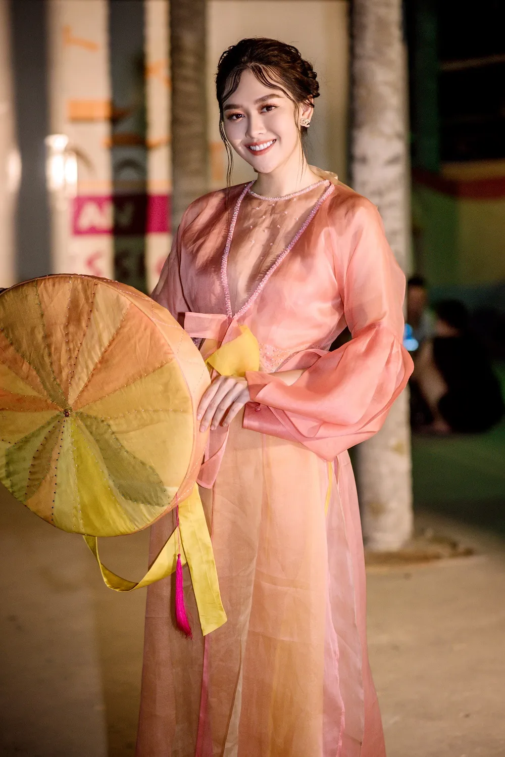 Tham gia trình diễn cùng hàng trăm diễn viên và người mẫu chuyên nghiệp khác, nàng Á hậu vẫn vô cùng nổi bật với vẻ đẹp tinh khiết, ngọt ngào trên sân khấu thực cảnh Ký ức Hội An.