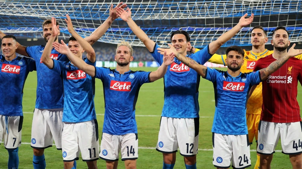 CLB Napoli ăn mừng chiến thắng 2-0 trước đương kim vô địch Champions League - Liverpool. ẢNH: REUTERS