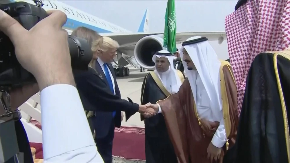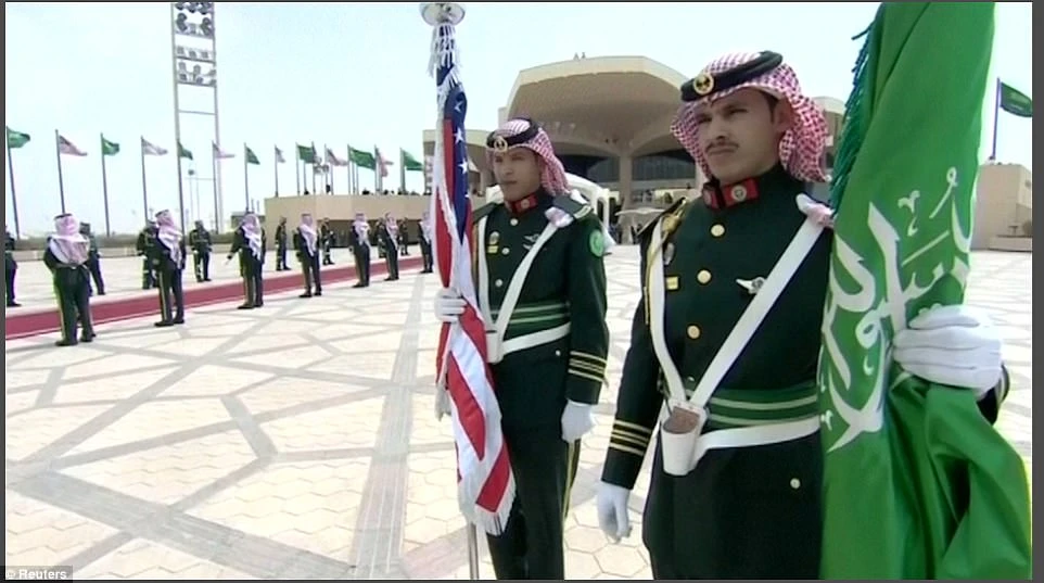 Theo NYDaily News, sau khi chiếc không lực một đáp xuống thủ đô Riyadh vào khoảng 10 giờ sáng 20-5 (giờ địa phương), Tổng thống Donald Trump cùng đệ nhất phu nhân Melania đã bước xuống cầu thang được trải tấm thảm đỏ to. Quốc vương Ả Rập Saudi King Salman, 81 tuổi, đã ra tận chân cầu thang trong tiết trời gần 40 độ C để tiếp đón Tổng thống Mỹ. Ngày 19-5, Tổng thống Mỹ Donald Trump cùng đệ nhất phu nhân Melania đến Ả Rập, bắt đầu chuyến công du kéo dài 9 ngày và chưa từng có tiền lệ trong lịch sử Mỹ.