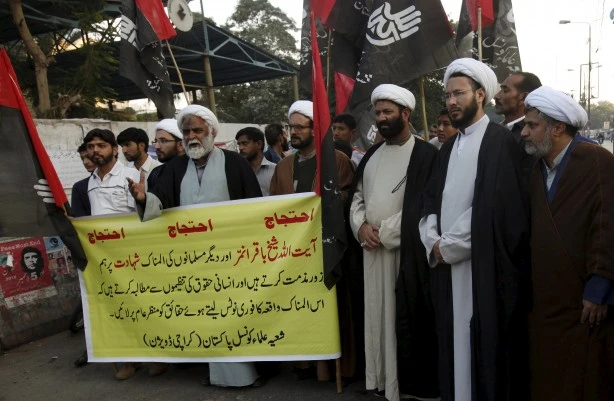 Những thành viên hội đồng học giả Shiite cầm bảng ủng hộ giáo sĩ Nimr al-Nimr, người bị tử hình ở Ả Rập Saudi, trong một cuộc biểu tình ở Karachi, Pakistan