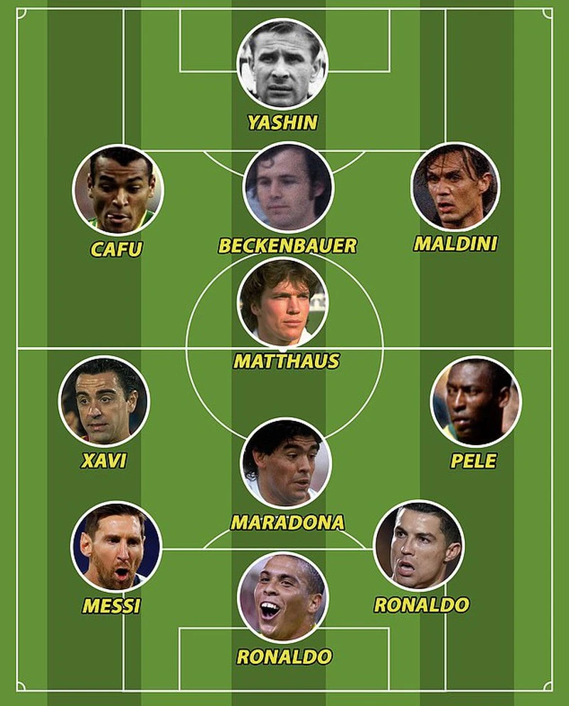 Hàng tiền vệ 4 người gồm Xavi (Tây Ban Nha), Matthaus (Đức), Maradona (Argentina) và Pele (Brazil). Bộ ba tiền đạo là Ronaldo (Bồ Đào Nha), Messi (Argentina) và Ronaldo (Brazil).
