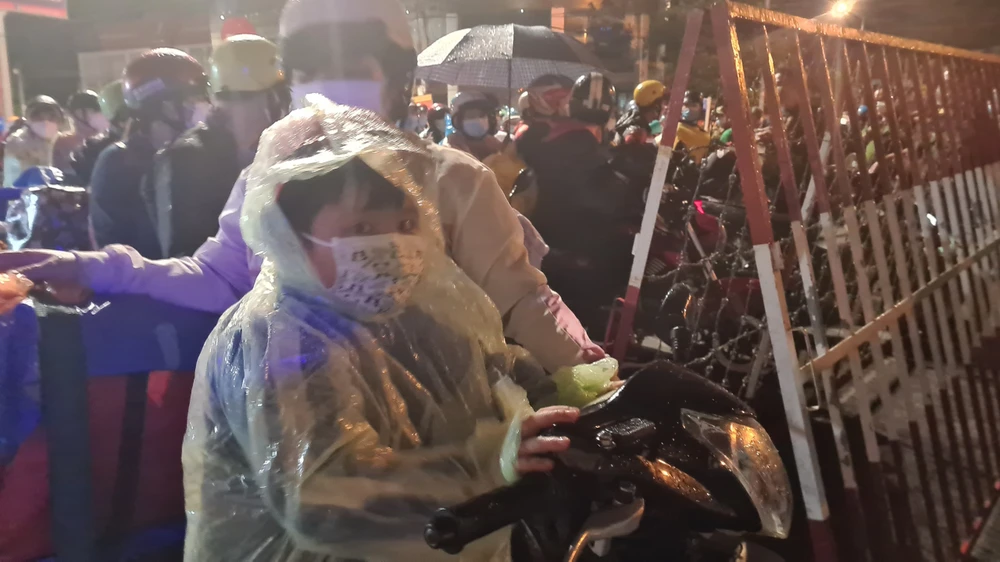 Người dân đứng dưới mưa đến 23 giờ đêm 1-10 ở Bình Dương với hy vọng qua được chốt để về quê. Ảnh: LÊ ÁNH