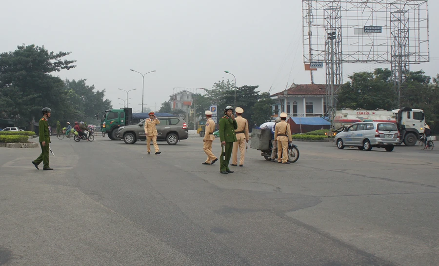 Sáng nay, Công an TP Vinh (Nghệ An) cũng phân luồng, hướng dẫn các phương tiện rẽ vào đường tránh TP Vinh và đường du lịch ven sông Lam. Ảnh: Đ.LAM