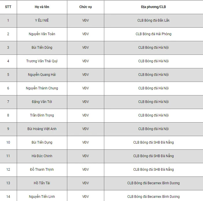 Trong danh sách 28 cầu thủ của Việt Nam, tất cả cầu thủ vừa giành HCV SEA Games 30 đều có tên ngoại trừ Văn Hậu (trở về CLB), Trọng Hoàng và Hùng Dũng (quá tuổi).