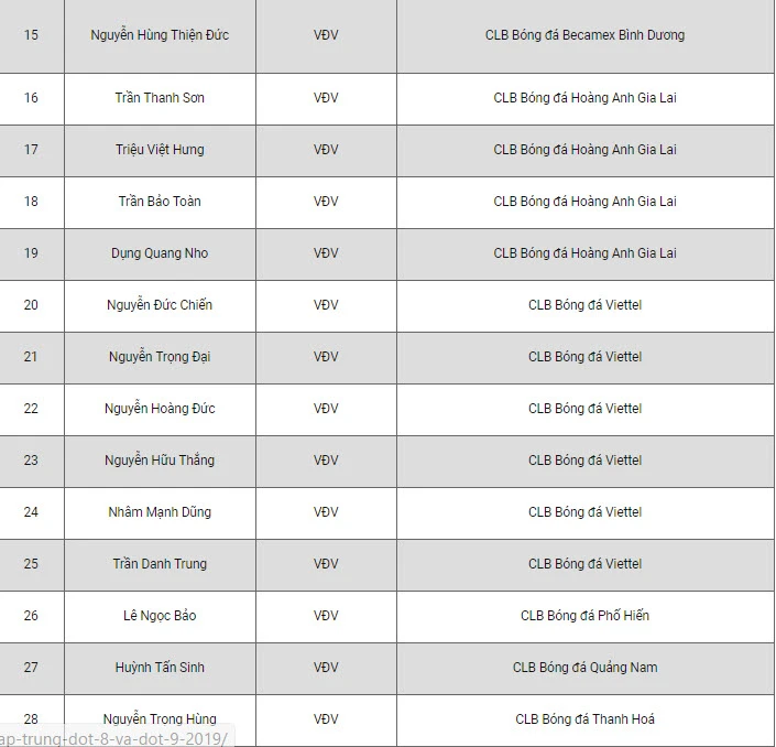 Tiền vệ Nguyễn Quang Hải và thủ môn Bùi Tiến Dũng là hai cái tên quen thuộc xuất hiện trong danh sách đi tập huấn. Tuy nhiên, Đoàn Văn Hậu, cầu thủ đang chơi cho CLV SC Heerenveen của Hà Lan sẽ không có mặt trong chuyến đi này. Lý do là Văn Hậu phải trở về CLB như cam kết để thi đấu”.
