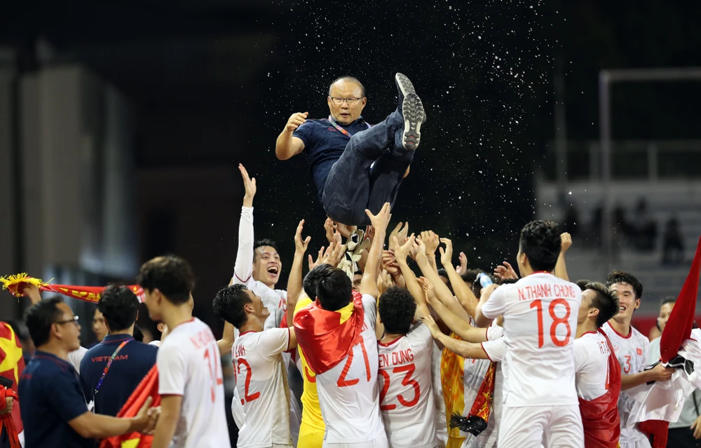 HLV Park Hang-seo được các học trò tung hô sau khi U-22 Việt Nam giành HCV SEA Games 30. Ảnh: ANH PHƯƠNG