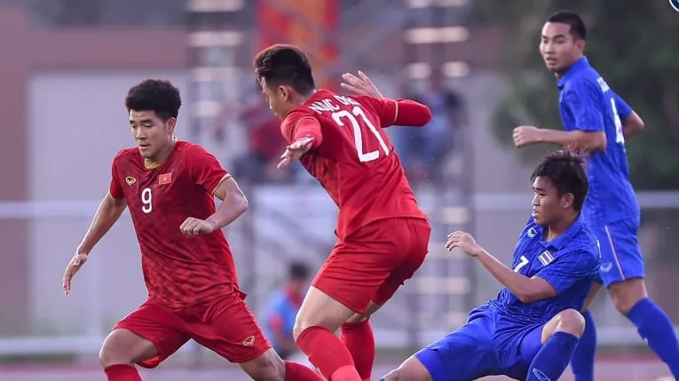 U-22 Việt Nam và U-22 Thái Lan cạnh tranh quyết liệt vé đi tiếp. Ảnh: FAT