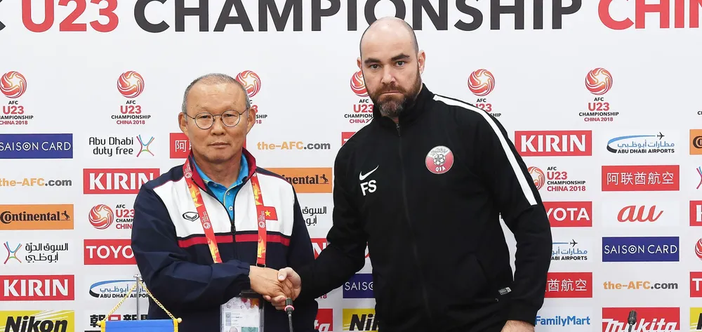 HLV Park Hang-seo và HLV Felix Sanchez bắt tay nhau trong cuộc họp báo trước trận đấu.