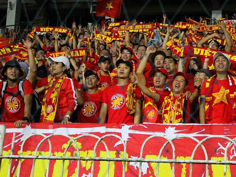 Các cổ động viên Việt Nam tiếp lửa cho đội tuyển làm nên chiến thắng trước chủ nhà Myanmar. Ảnh: HUY HÙNG