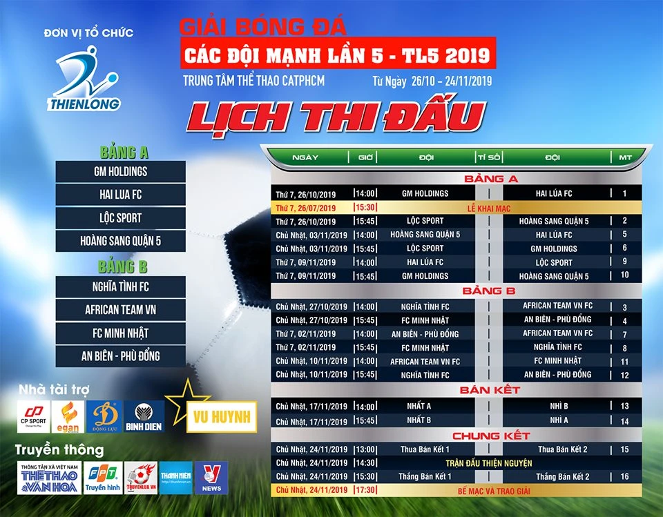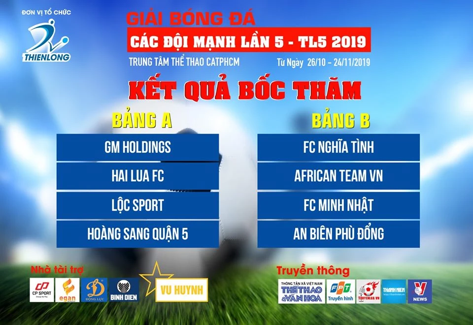Giải bóng đá các đội mạnh lần thứ 5 - TL5 2019 diễn ra từ ngày 26-10 đến 24-11 tại Trung tâm thể thao Công an TP.HCM (đối diện Đầm Sen). Giải quy tụ tám đội mạnh nhất của “làng phủi” bóng đá phía Nam.