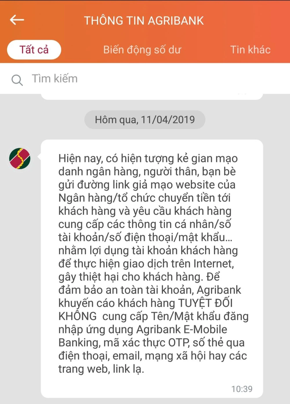tin nhắn cảnh giác được Ngân hàng Agribank gửi đến khách hàng