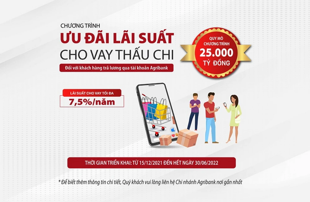 Cụ thể, từ ngày 15-12-2021 đến hết ngày 30-06-2022, Agribank triển khai chương trình cho vay thấu chi với lãi suất ưu đãi, tối đa 7,5%/năm đến các khách hàng trả lương qua tài khoản. Lãi suất ưu đãi được áp dụng đối với các khoản thấu chi mới cũng như các khoản dư nợ thấu chi hiện hữu. Bên cạnh việc được hưởng lãi suất ưu đãi, khách hàng còn được hưởng các chính sách miễn, giảm phí dịch vụ, miễn phí phát hành thẻ ghi nợ nội địa (ATM) đối với khách hàng mở tài khoản thanh toán trả lương tại Agribank.