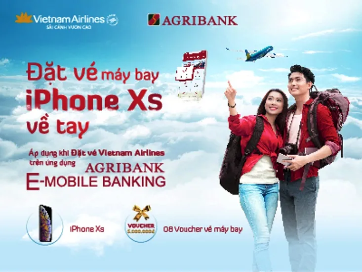 Đặt vé máy bay - iPhone Xs về tay” để có thể sở hữu chiếc iPhone Xs cùng các giải thưởng giá trị khác với ứng dụng Agribank E-Mobile Banking.