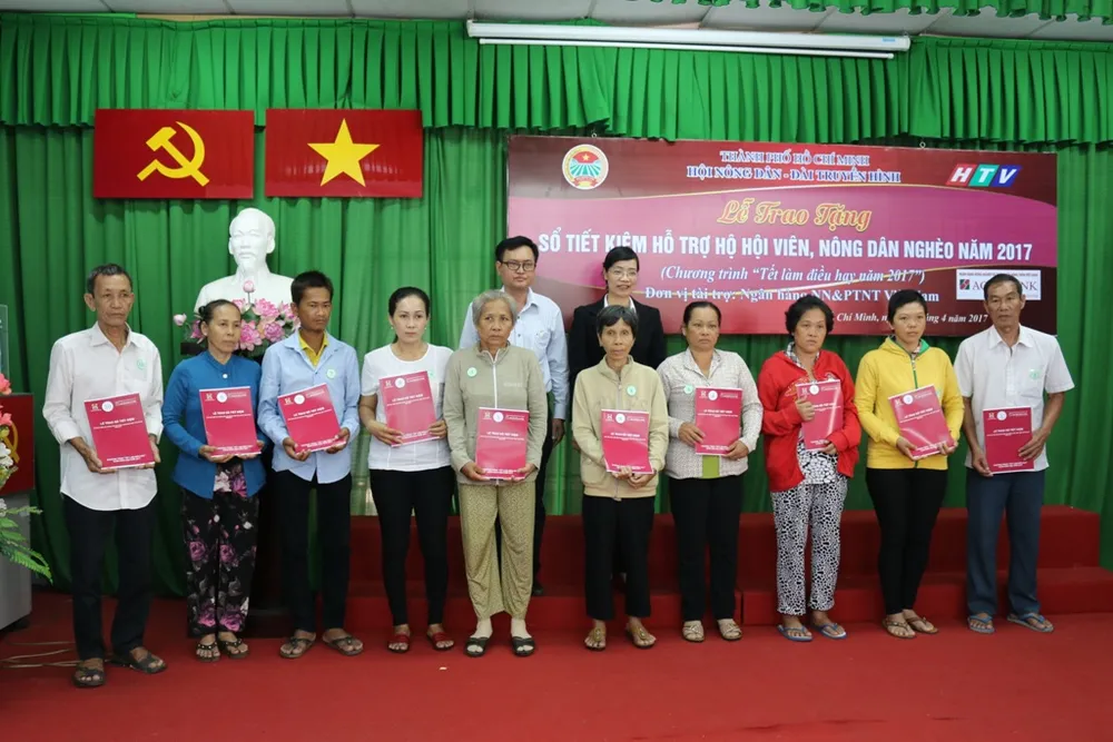 Đại diện Agribank và Hội Nông dân TP.HCM lên trao sổ tiết kiệm cho hộ hội viên, nông dân nghèo.