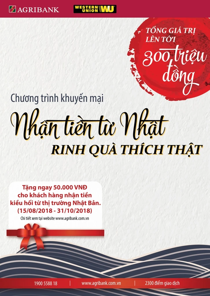 Theo đó, khách hàng nhận tiền Western Union từ Nhật Bản tại quầy giao dịch của Agribank trên phạm vi toàn quốc trong thời gian nói trên sẽ được nhận ngay một phần quà khuyến mại bằng tiền mặt là 50.000 đồng. Chương trình này sẽ có 6.000 phần quà với tổng giá trị là 300 triệu đồng.