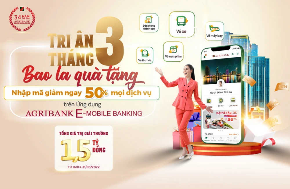Nhân dịp 34 năm thành lập, Agribank trân trọng gửi tới quý khách hàng chương trình ưu đãi hấp dẫn “Tri ân tháng 3 – bao la quà tặng”. Theo đó, từ nay đến hết 31-3, tất cả các khách hàng sẽ được tặng ngay bộ mã giảm giá 50% khi trải nghiệm các dịch vụ, tiện ích trên ứng dụng Agribank E-Mobile Banking. Cụ thể: Nhập mã PHIM83, giảm ngay 50% (tối đa 83.000 đồng) khi đặt vé xem phim. Nhập mã MBKS200, giảm ngay 50% (tối đa 200.000 đồng) khi đặt vé máy bay/đặt phòng khách sạn. Nhập mã TAUXE100, giảm ngay 50% (tối đa 100.000 đồng) khi đặt vé tàu/đặt vé xe. Nhập mã GOLF1000, giảm ngay 50% (tối đa 1.000.000 đồng) khi đặt sân Golf.