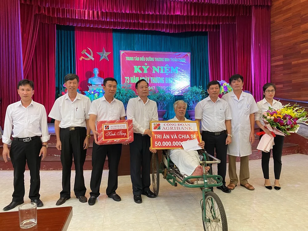 Dịp này, Công đoàn Agribank đã tri ân và tặng quà cho thương bệnh binh, người có công tại một số Trung tâm điều dưỡng thương bệnh binh, người có công với cách mạng, như: Trung tâm Điều dưỡng Lạng Giang - Bắc Giang; Kim Bảng, Duy Tiên, Liêm Cần - Hà Nam; Sầm Sơn - Thanh Hóa; Long Đất - Bà Rịa Vũng Tàu; Thuận Thành – Bắc Ninh… với tổng số tiền 420 triệu đồng.