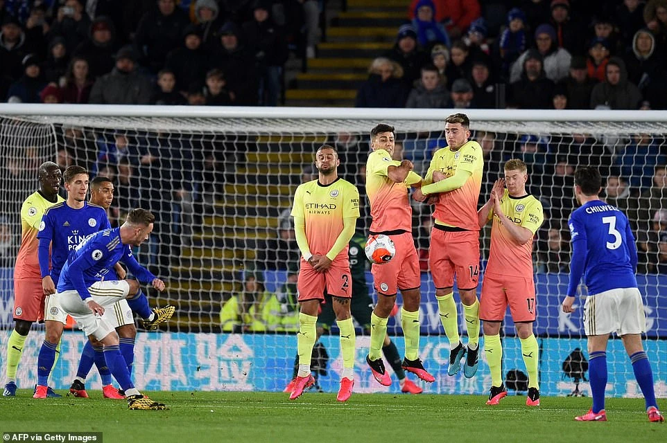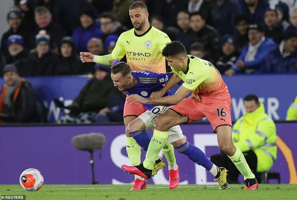 Maddison có pha đá phạt đưa bóng chạm tay De Bruyne nhưng trọng tài không cho đội nhà hưởng phạt đền.