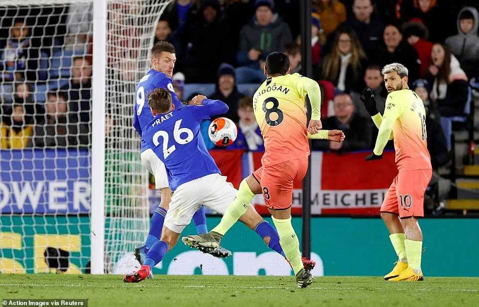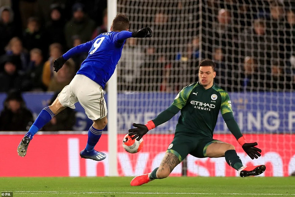 Vardy có pha dứt điểm đánh bại thủ môn Ederson nhưng bóng lại đi trúng cột dọc.
