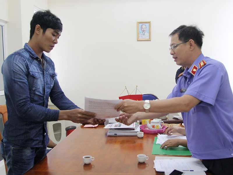 Đại diện VKSND huyện Bình Chánh, TP.HCM trao quyết định đình chỉ minh oan cho Ong Văn Sệt. Ảnh: HOÀNG GIANG