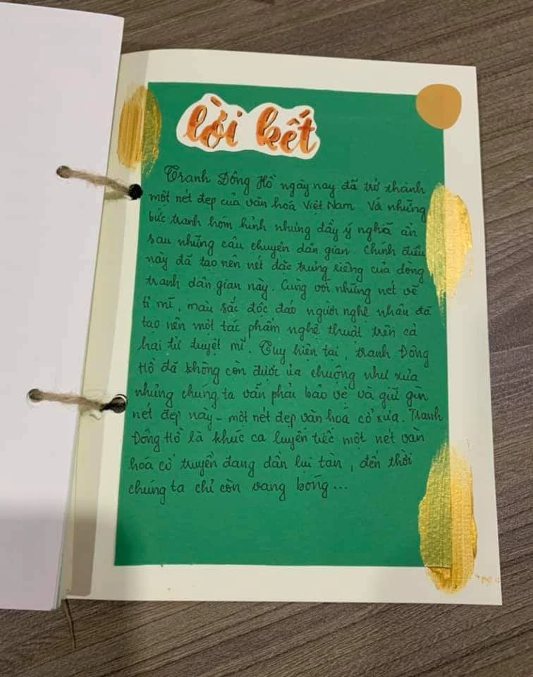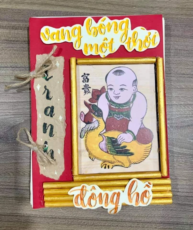 Tôi nhận ra sự thích thú, tự hào, say mê và nghiêm cẩn của các em khi nghiên cứu về tranh Đông Hồ để thực hiện chuyên đề của mình. Ngay từ trang bìa, các em đã trình bày rất đẹp và bắt mắt với nền đỏ và hàng chữ mềm mại: “Vang bóng một thời: TRANH ĐÔNG HỒ”. Nổi bật là bức tranh Em bé ôm vịt mang ý nghĩa vinh hoa – phú quý, cũng là ước nguyện ngàn đời của người Việt.