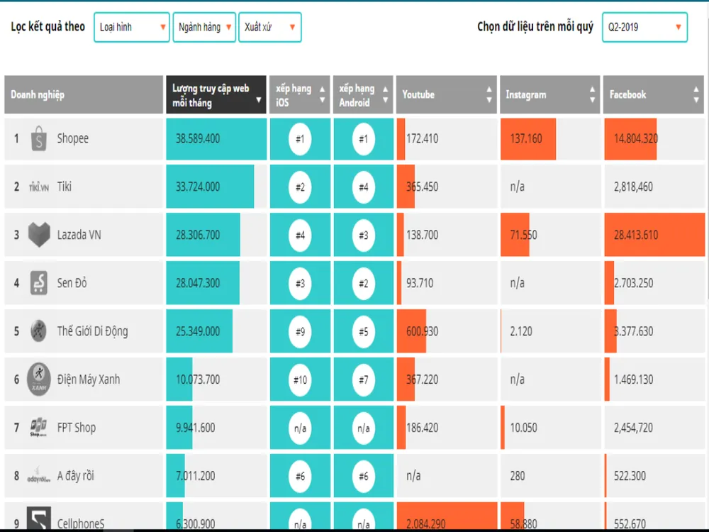 Mới đây Iprice Insights (đơn vị nghiên cứu thị trường của iPrice Group- cổng thương mại điện tử tại 7 thị trường Đông Nam Á) đã đưa ra số liệu cũng như bảng xếp hạng top 50 doanh nghiệp thương mại điện tử (TMĐT) tại Việt Nam. Bảng xếp hạng này dựa trên lượt truy cập trong bình theo quý, xếp hạng ứng dụng di động và số người theo dõi trên mạng xã hội.