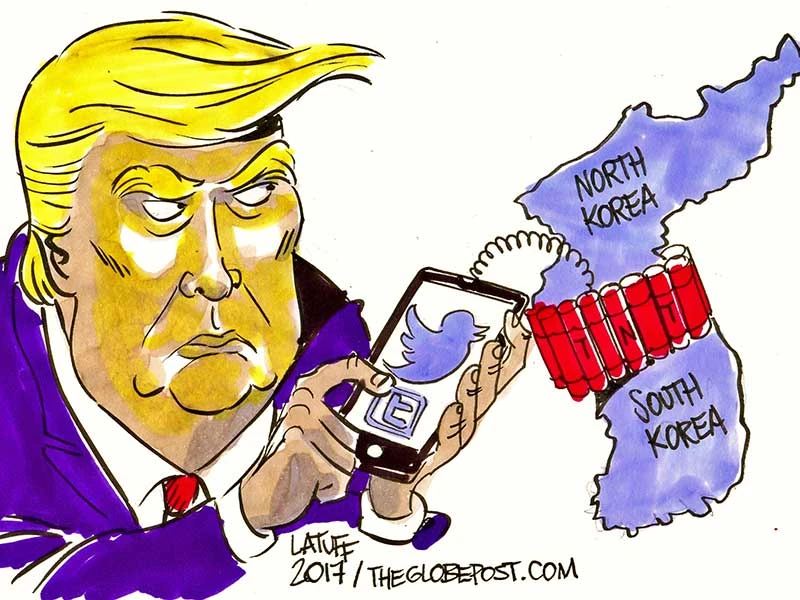 Tổng thống Trump với căng thẳng có thể bùng nổ trên bán đảo Triều Tiên. Biếm họa của Carlos Latuff (Brazil)
