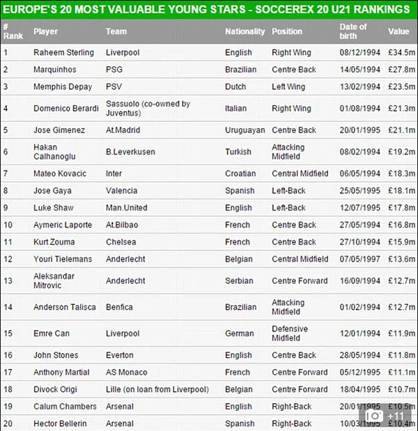 Trong BXH top 20 cầu thủ trẻ giá trị nhất Châu Âu, ngoài Sterling còn có 3 cầu thủ Anh khác góp mặt trong top 20 là Luke Shaw (Man United), John Stones (Everton) và Calum Chambers (Arsenal).