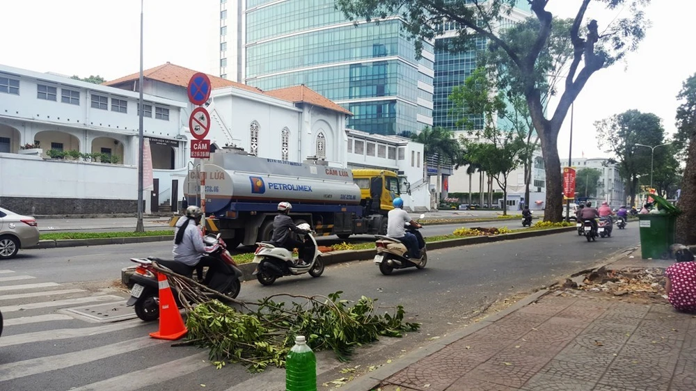 Hiện các cây xanh trên đường Tôn Đức Thắng đang được đốn hạ.