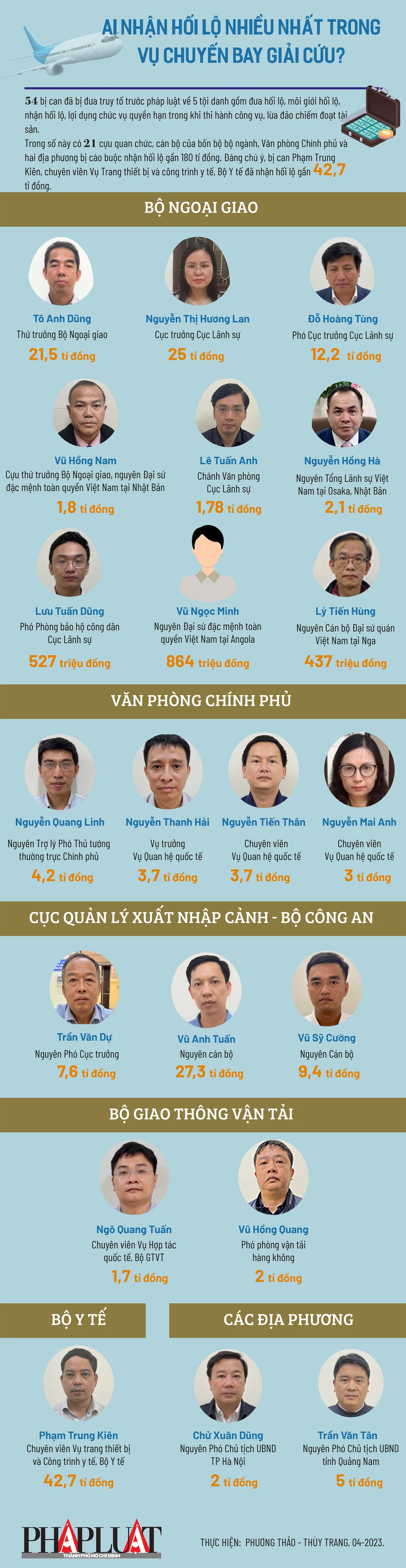 (PLO)- 21/54 bị can là cựu quan chức, cán bộ của bốn bộ ngành, Văn phòng Chính phủ và các địa phương bị cáo buộc nhận hối lộ gần 180 tỉ đồng trong vụ chuyến bay giải cứu.