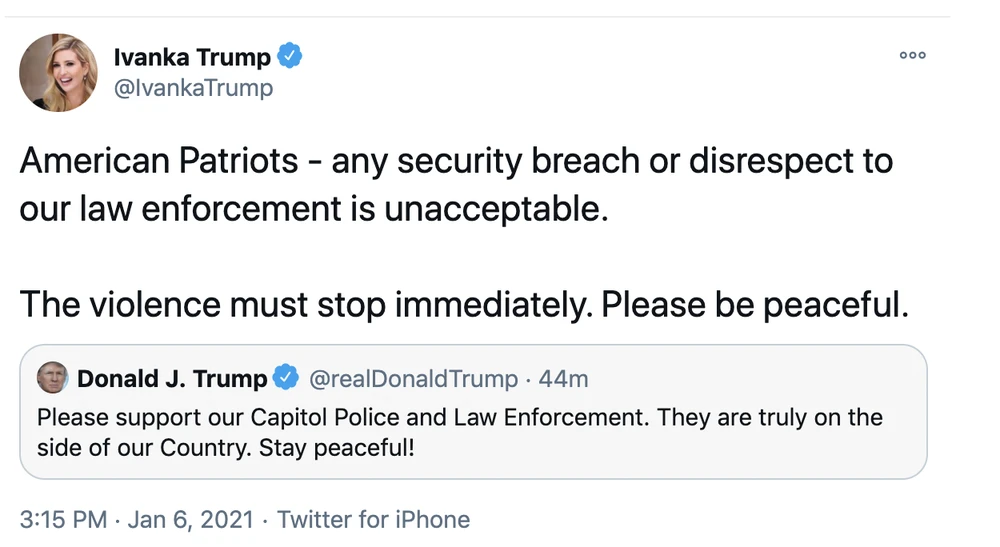 "Người Mỹ yêu nước - bất kỳ sự xâm phạm an ninh hay không tôn trọng lực lượng hành pháp đều không thể chấp nhận. Bạo lực phải chấm dứt ngay lập tức. Xin hay giữ ôn hòa" - cô Ivanka viết trên Twitter.