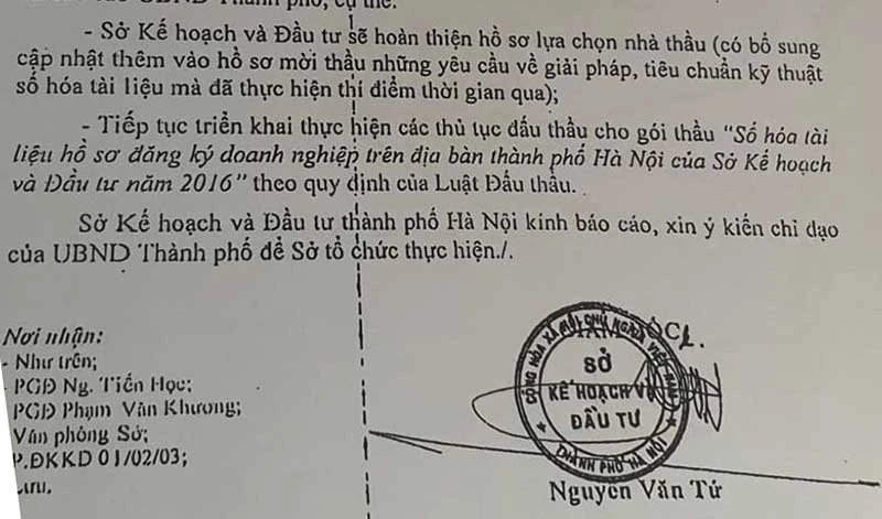 Vì vậy, ông Tứ tiếp tục đề nghị thực hiện các thủ tục đấu thầu cho gói thầu số hóa tài liệu hồ sơ đăng ký doanh nghiệp trên địa bàn TP Hà Nội.