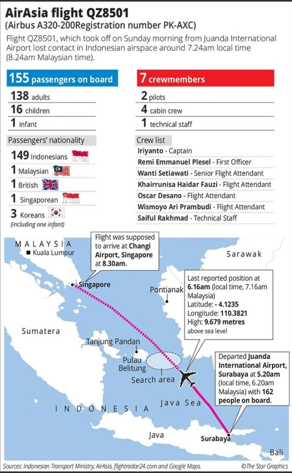 Chiếc máy bay này cất cánh từ sân bay quốc tế Juanda (Indonesia) bay đến sân bay quốc tế Changi của Singapore và đã mất liên lạc sau 42 phút.